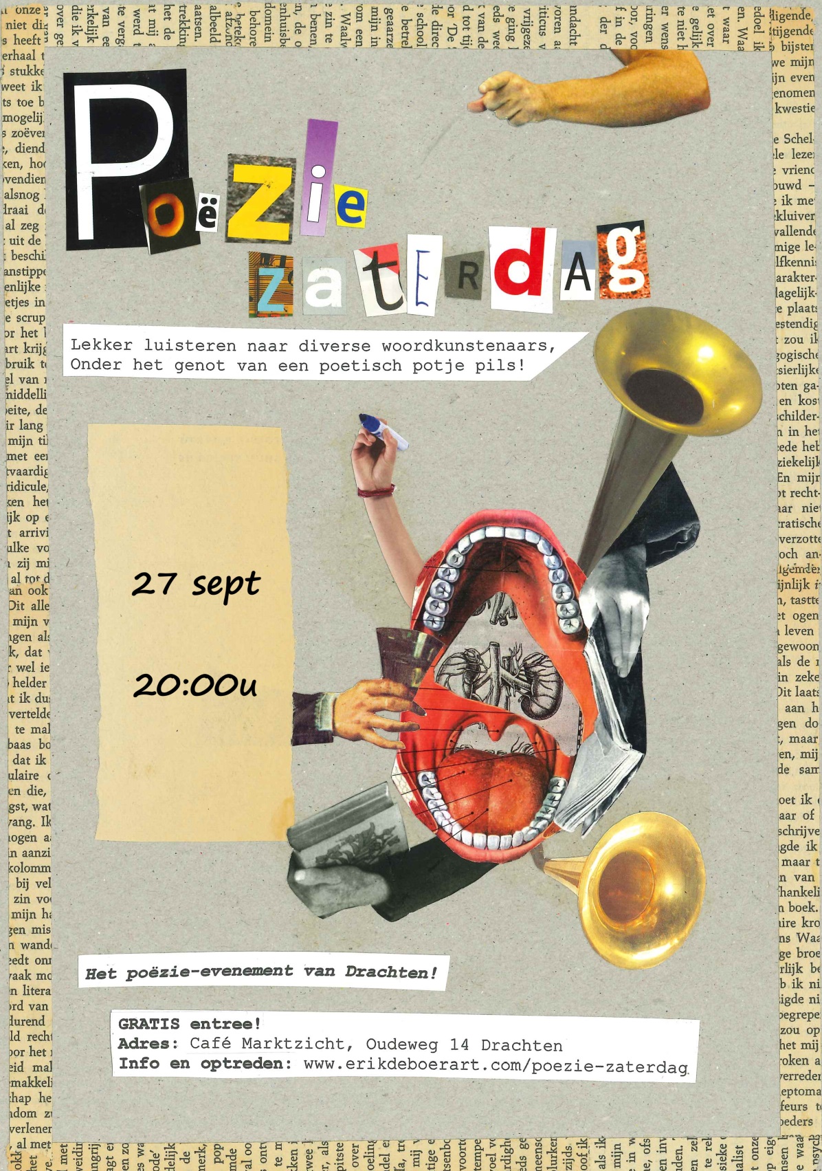 Kunst en Vrijheid, Hoofdstraat 11 te Eenrum Op zondag 31 augustus 15.00 starten we het culturele seizoen met een tentoonstelling van Ed Wullink, muziek van Jankobus Seunnenga en gedichten van Joanna Paszkiewicz, Ed Wullink, Jelou Dichter (light-verse) en Kasper Peters. Wullink is self made beeldend kunstenaar en dichter. Om 15:00u openen we de middag met de expo van zijn object "Chaos". Jankobus Seunnenga maakte ooit landelijk furore met de punkband Kobus Gaat Naar Appelscha en later met het folktrio Pigmeat. Dagblad van het Noorden: ‘In Seunnenga valt een Drs.P-achtige klasse te ontwaren, gebaseerd op een droog-komische presentatie van ontroerend absurdistische liedjes’. Ed Wullink en Joanna Paszkiewicz publiceerden hun poëzie in KLADBLOK, een open podium op papier dat verscheen van april 2001 tot en met december 2023. In totaal verschenen 250 afleveringen met duizenden bijdragen van dichters, tekenaars, fotografen en mail art-kunstenaars uit de hele wereld. Onze eigen Eenrummer dichter Kasper Peters sluit de middag rond 17:00u af. NB: reserveren gewenst via info@kunstenvrijheid.nl Entree: €5 |